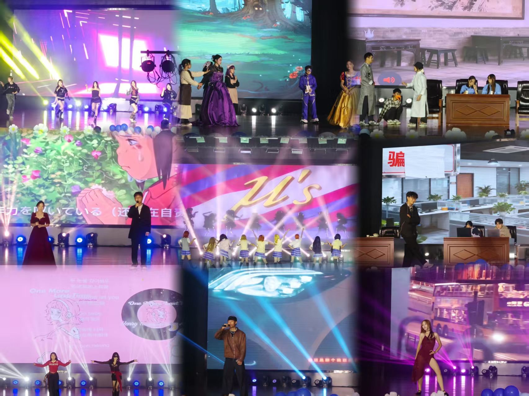 郭山小、耿雨欣携手带来的合唱《骑在银龙背上》,以清亮通透的声线传递出满满的追梦热忱,将现场氛围推向温馨高潮。随后的emoji猜词互动环节,更是引得全体同学踊跃参与、积极抢答,欢声笑语弥漫全场;小品《骗你没商量公司年终会》则以贴近生活的喜剧情节为切入点,巧妙融入反诈宣传,生动提醒同学们“谨防诈骗,从我做起”,兼具趣味性与教育意义。