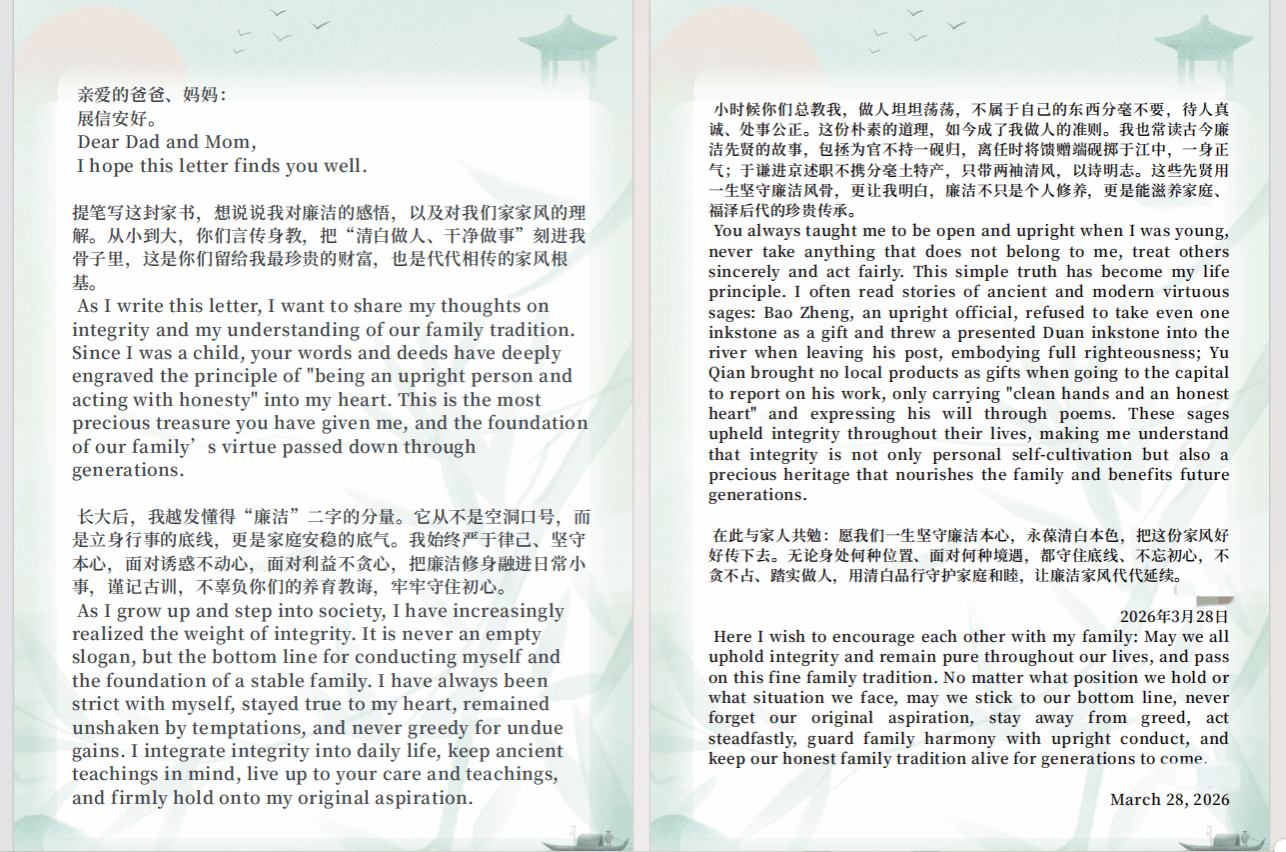 学院在职教职工与在校学生以笔为媒、以情寄意,一封封饱含深情的家书纷至沓来。或追忆家族长辈廉洁奉公的过往,讲述代代相传的清廉家风;或结合自身学习生活经历,分享对廉洁内涵的深刻体悟,于日常小事践行廉洁理念;或向家人许下廉洁承诺,叮嘱亲人坚守原则、清白做人。同时,师生充分发挥外国语专业特色,将廉洁理念以中英双语形式呈现,让清风正气更具感染力与国际传播力。