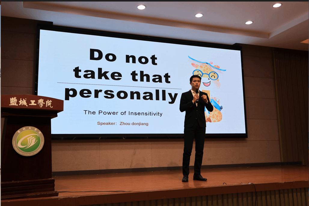 2023年11月17日晚,由外国语学院承办的盐城工学院第十六届“新东方”杯大学生英语演讲比赛“The Power of Insensitivity”决赛在南校区机械馆报告厅顺利进行。外国语学院党总支书记谷文华、党总支副书记倪璞应邀出席,副院长吴斌、英语系王奇教授、学工办副主任周良尧、英语系刘奕四位老师担任评委,来自各学院的250余名同学观看比赛。