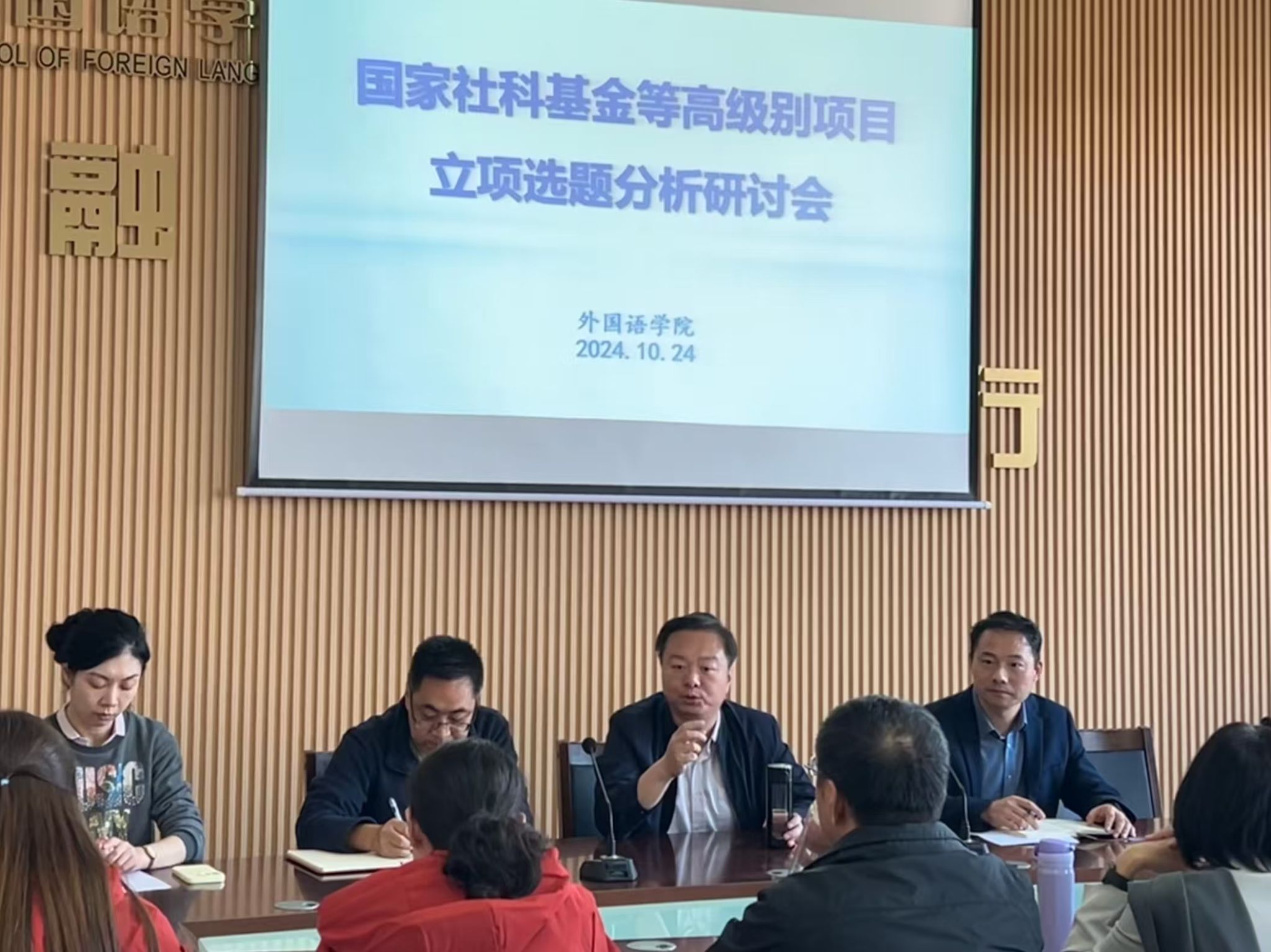 为进一步提高国家社科基金等高级别项目申报的质量和成功率,10月24日下午,外国语学院在润美楼A404会议室举办国家社科基金等高级别项目立项选题分析研讨会。院长叶磊出席,拟申报2025年国家社科基金项目、教育部人文社科项目、省社科基金项目的教师以及“揭榜挂帅”项目团队全体成员参与讨论交流。本次研讨会由副院长吴斌主持。