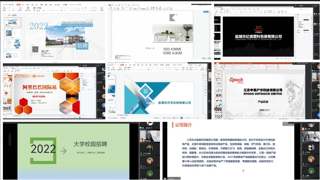 为贯彻落实二十大报告提出的“实施就业优先战略,强化就业优先政策”的决策部署,加快推进外国语学院毕业生就业工作步伐,11月9日下午,学院组织开展线上专场招聘宣讲会,邀请阿里巴巴国际站金橙数科公司、江苏金茂环保科技有限公司、江苏申鹏户外科技有限公司、江苏苏茵新材料科技有限公司、江苏先木智能科技有限公司、盐城可美智能家居公司、盐城市亿德塑料包装有限公司、盐城元亨玩具公司等八家企业负责人进行线上招聘宣讲。学院党总支书记谷文华主持,党总支副书记倪璞、学工办副主任周良尧,毕业班辅导员,以及2019级毕业班全体学生参加会议。