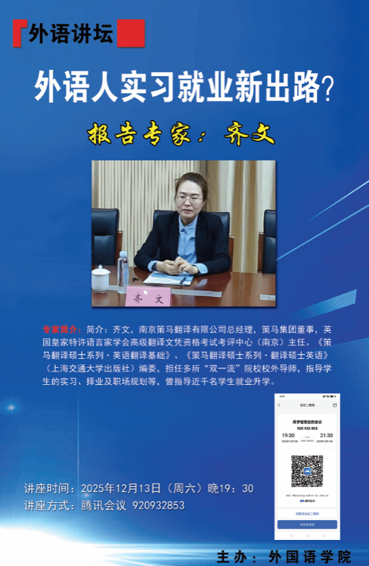 2025年12月13日晚,外国语学院邀请学院产学合作企业--南京策马翻译有限公司总经理齐文女士,通过线上方式为英语专业2024级、2025级学生及英语专业教师近200人,作了题为“外语人实习就业新出路”的专题讲座。讲座由学院副院长周学恒主持。