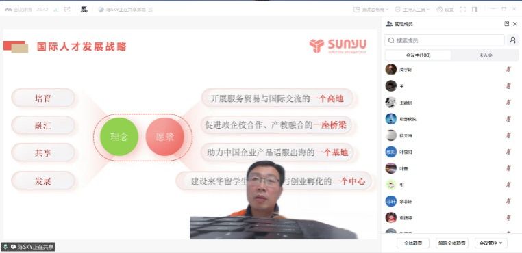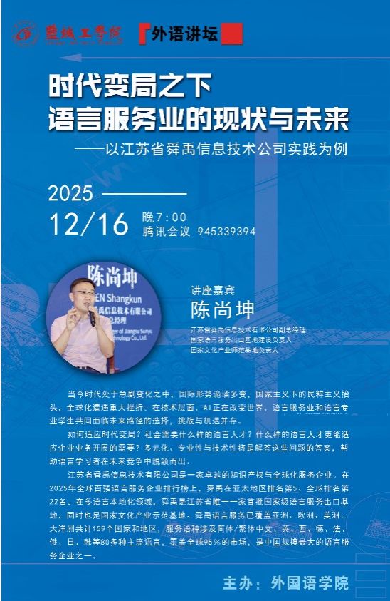 2025年12月16日晚,外国语学院通过线上讲座方式成功举办“时代变局下语言服务业的现状与未来”主题讲座。本次讲座特邀江苏省舜禹信息技术有限公司副总经理、国家语言服务出口基地建设负责人陈尚坤先生担任主讲嘉宾,学院叶磊院长主持,副书记倪璞、副院长周学恒及学院师生150余人线上参加。