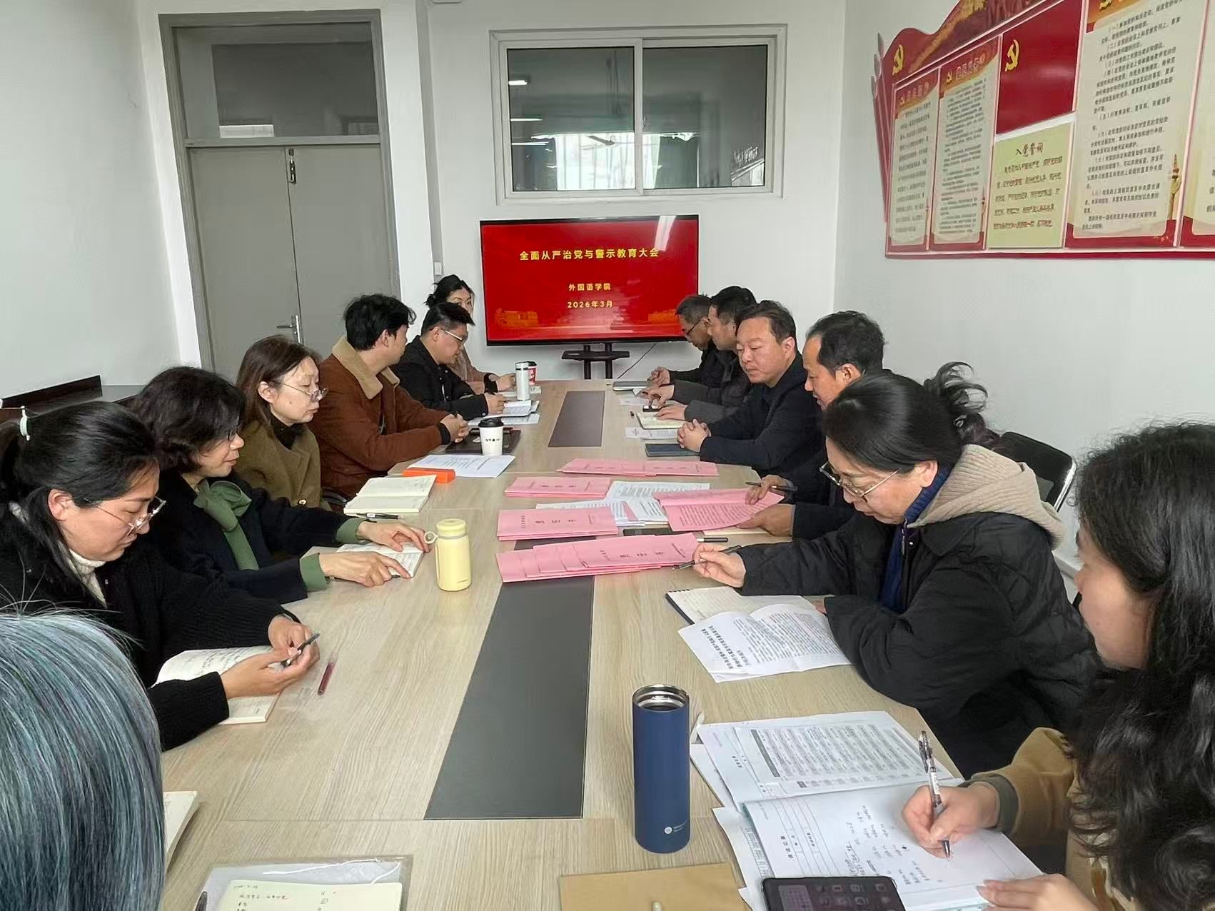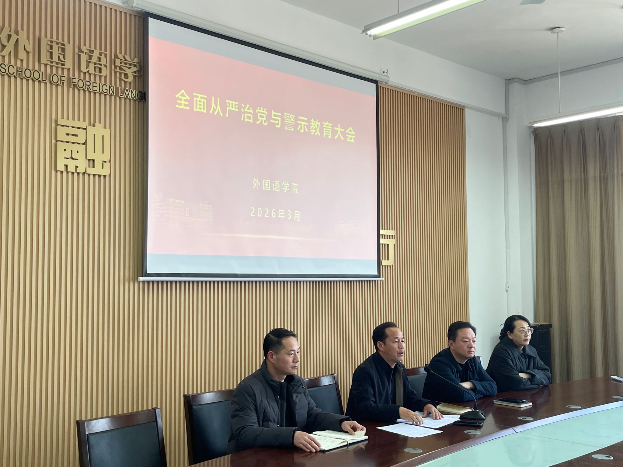 3 月 25 日下午,外国语学院在润美楼 A404 会议室召开 2026 年全面从严治党工作与警示教育大会。学院党政领导班子成员、各党支部书记、各科室及专业系负责人、全体教师党员参加会议,学院党总支书记刘正华主持会议。