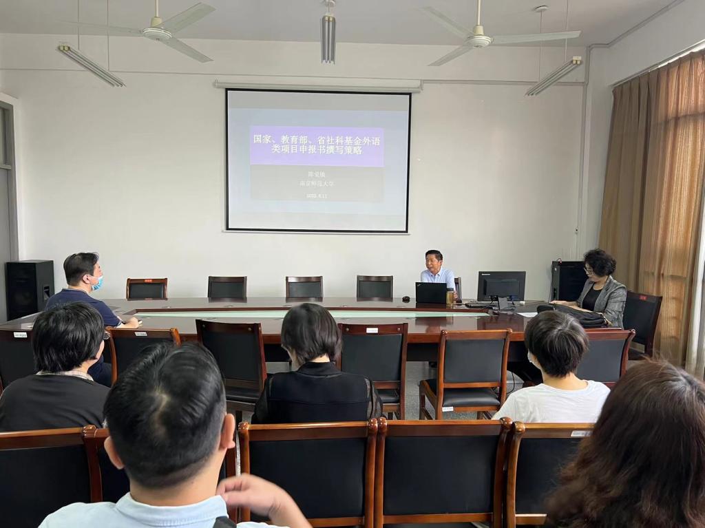 9月11日下午,在润美楼A404会议室,南京师范大学陈爱敏教授应邀来校作题为《国家、教育部、省社科基金外语类项目申报书撰写策略》的专题辅导讲座。报告会由外国语学院院长齐金花主持,参加课题申报的相关老师参会。