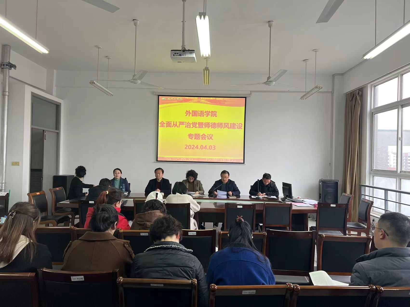 4月3日下午,外国语学院在南校区润美楼A404会议室召开全面从严治党暨师德师风建设专题会议。学院党总支书记谷文华主持,学院全体教职工参加。