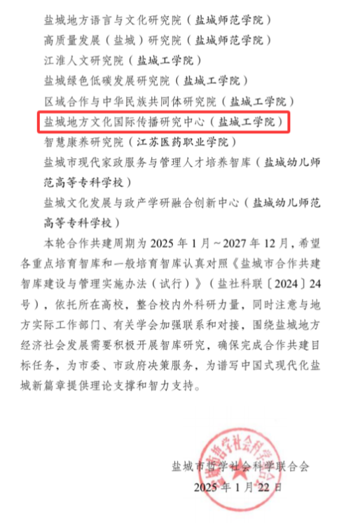盐城地方文化国际传播研究中心成立于2025年1月,是盐城市哲学社会科学界联合会与盐城工学院合作共建的新型智库,同时也是盐城工学院服务国家对外传播战略需求和盐城城市国际化发展的一个品牌项目。中心现有专职研究人员12人(其中高级职称人员9人,博士人员6人),形成了一支跨学科、高水平的智库研究团队。中心聚焦盐城地方文化(湿地文化、海盐文化、淮剧文化等)的海外译介与国际传播,深入挖掘盐城地方文化内涵,致力推动盐城地方文化走向世界。